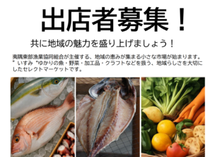 大原漁港 土曜マーケット 初回開催日決定!! 2026 1/22 未分類 2026年1月22日 株式会社 SOTOBO ISUMI 大原漁港 土曜マーケット 初回開催日決定!! | 株式会社 SOTOBO ISUMI 夷隅東部漁業協同組合主催「大原漁港 土曜マーケット」の初回開催日が2026年2月21日(土)に決定しました。あわせて、出店者も決定し、開催に向けた準備を進めています。 ... 未分類 よかったらシェアしてね! URLをコピーしました! URLをコピーしました! 出店者募集を開始しました。 この記事を書いた人 pc01@hiari この著者の記事一覧へ 関連記事 漁業の力で地域を元気に 2026年1月22日 出店者募集を開始しました。 2026年1月22日